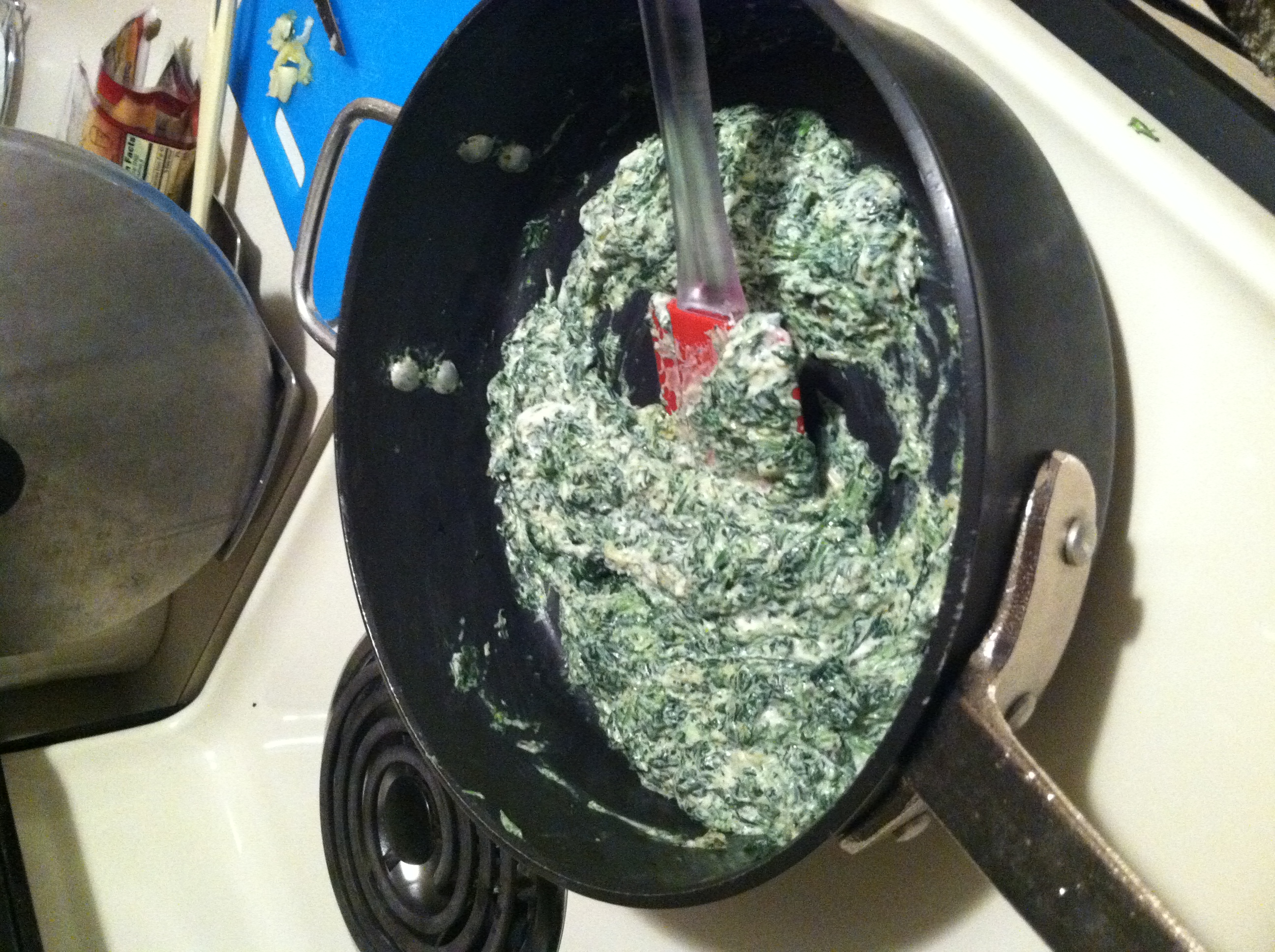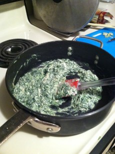 Thaw and drain spinach(if using frozen) or add the fresh spinach directly to the pan- either way add the spinach to the pan at this point. If fresh-stir until the spinach is wilted (1-2 minutes).