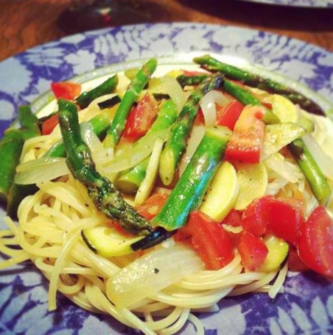 2) Heat some olive oil in a sauté pan, add Garlic and cook until softened through. Add your Onion slices and cook until softened. Next add the Asparagus pieces. Cook for about 3-4 minutes and add the squash and zucchini. Lastly when everything is mostly cooked to your liking add the tomatoes(basically just to heat them through).