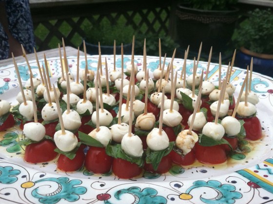 I have also made another version of this amazing invention! It is an party appetizer version of the same thing. So fun and cute and soooo easy to make and eat! You use all the same ingredients except in different forms. This time you will need GRAPE TOMATOES and small MOZZARELLA BALLS oh and toothpicks! I just slice the tomatoes in half and start poking away with the toothpick. I usually do Mozzaralla, basil, tomato. I find they don’t easily slip off that way and they stand up straight on a platter, but you can do what you like 🙂