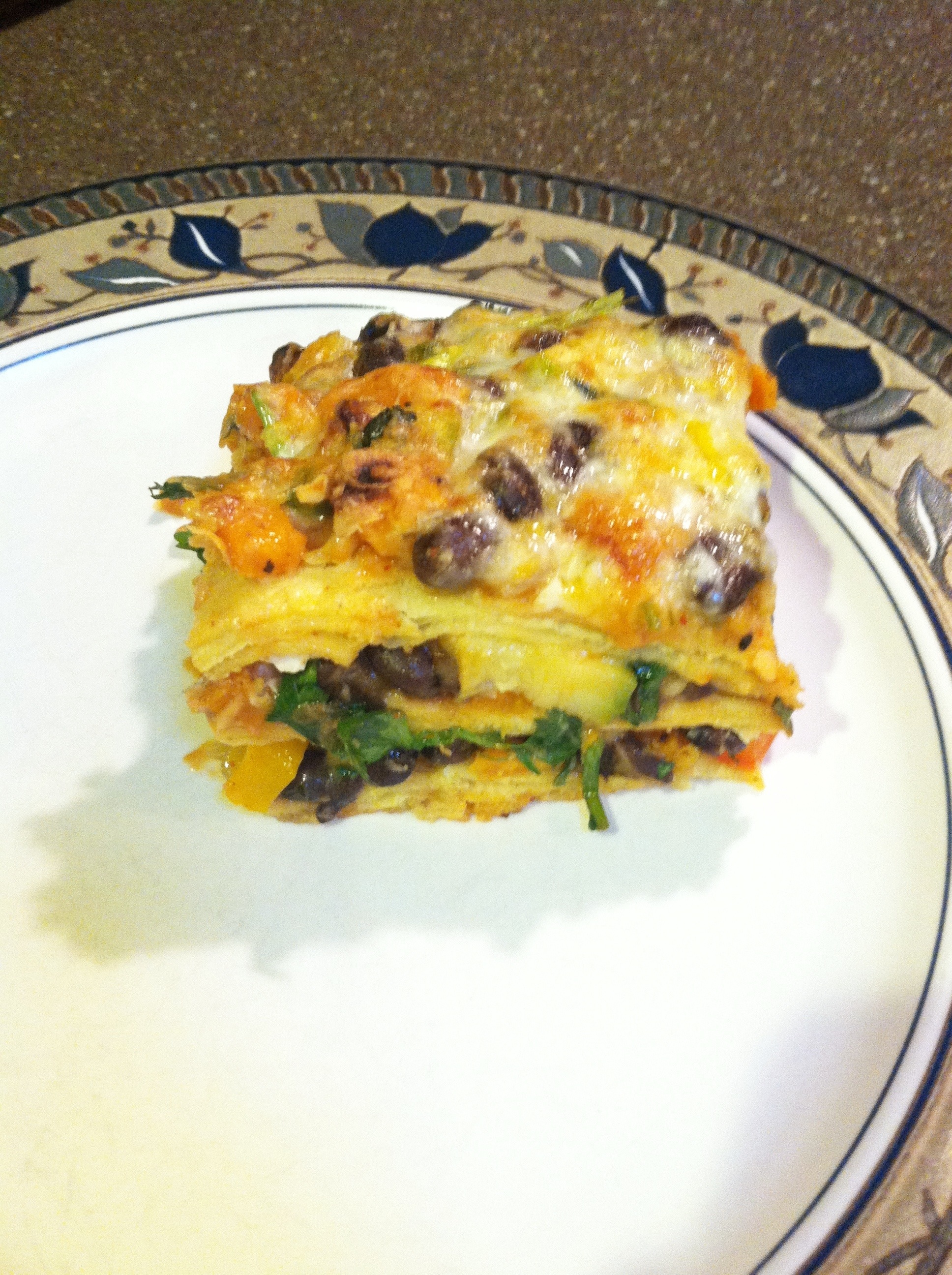3. Spread 1/4 cup of enchilada sauce into the bottom of the baking pan. Add a layer of tortillas, to completely cover the bottom of the pan(See my picture before for a trick!). Top with 1/3 of the vegetable/bean mixture and 1/3 of the cheese. Make a second layer of tortilla, enchilada sauce, vegetables/beans, and cheese. Top with with a layer of tortillas, enchilada sauce, vegetables/beans, and cheese. Spray a sheet of aluminum foil with cooking spray and cover the pan.