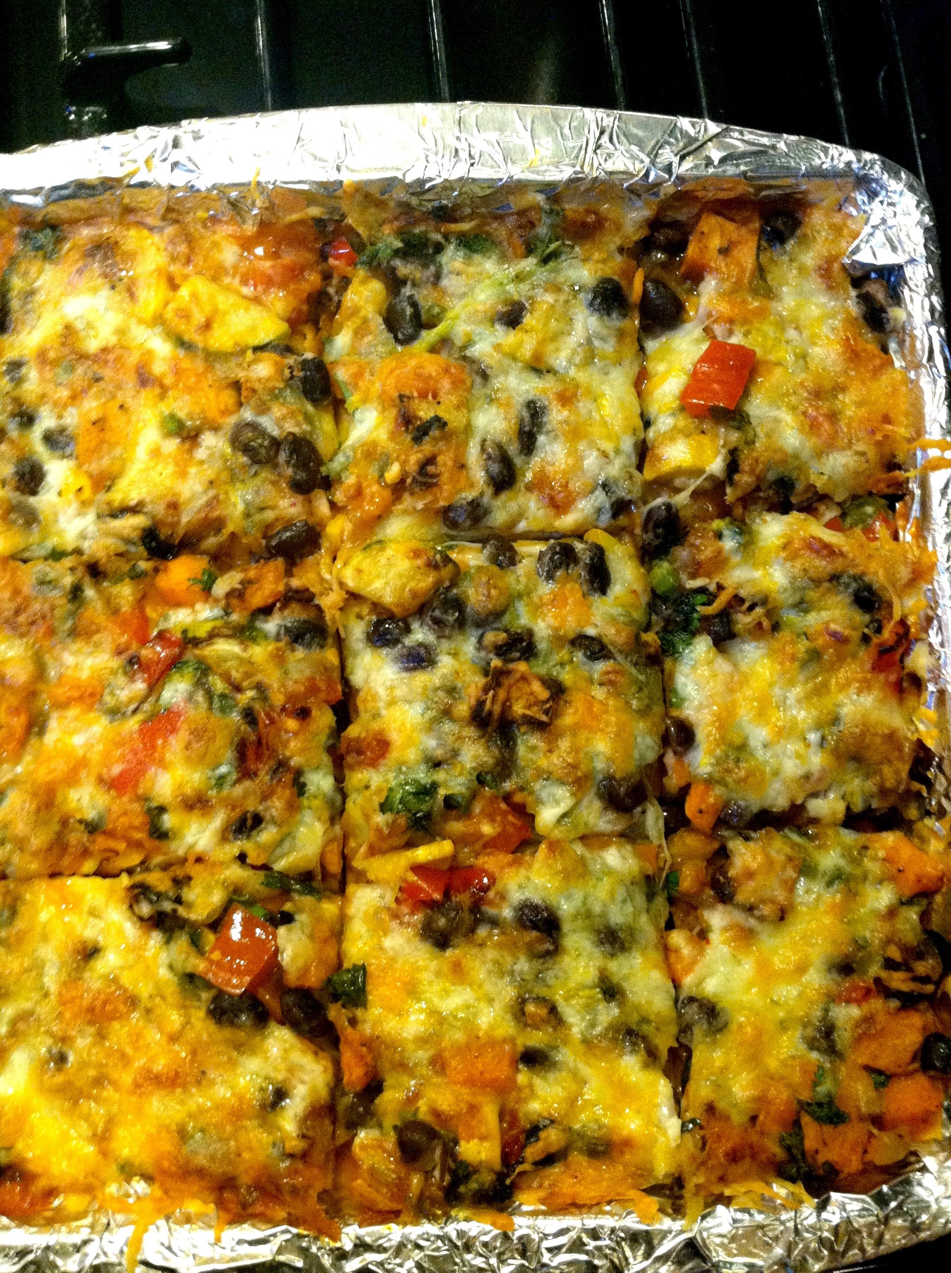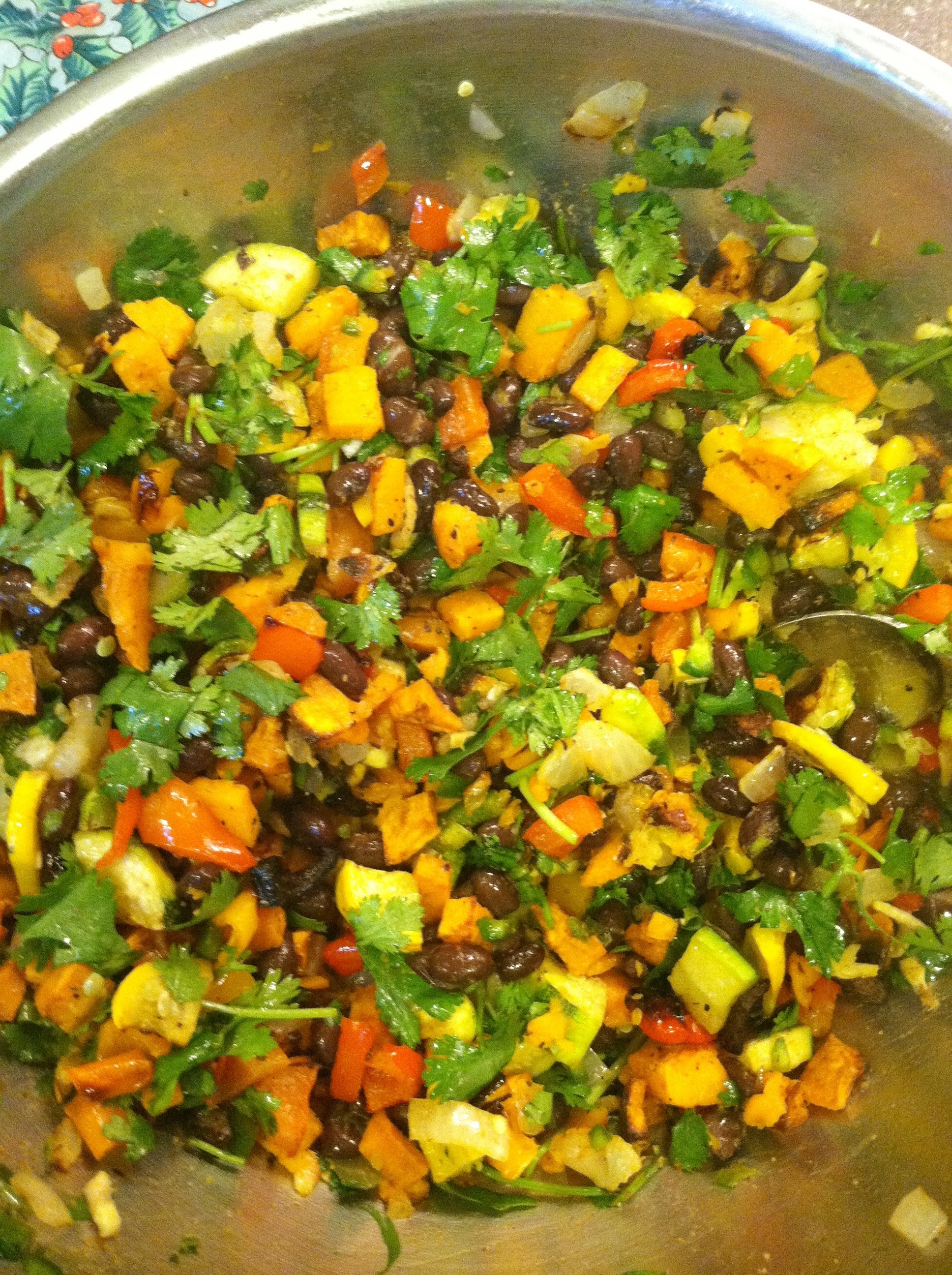 2. Grease an 8×8 square baking pan and set aside. In a medium bowl, combine roasted vegetables, black beans, cumin, chili powder, garlic, jalapeño, lime zest and juice(if using) and cilantro. Stir and season with salt and pepper.