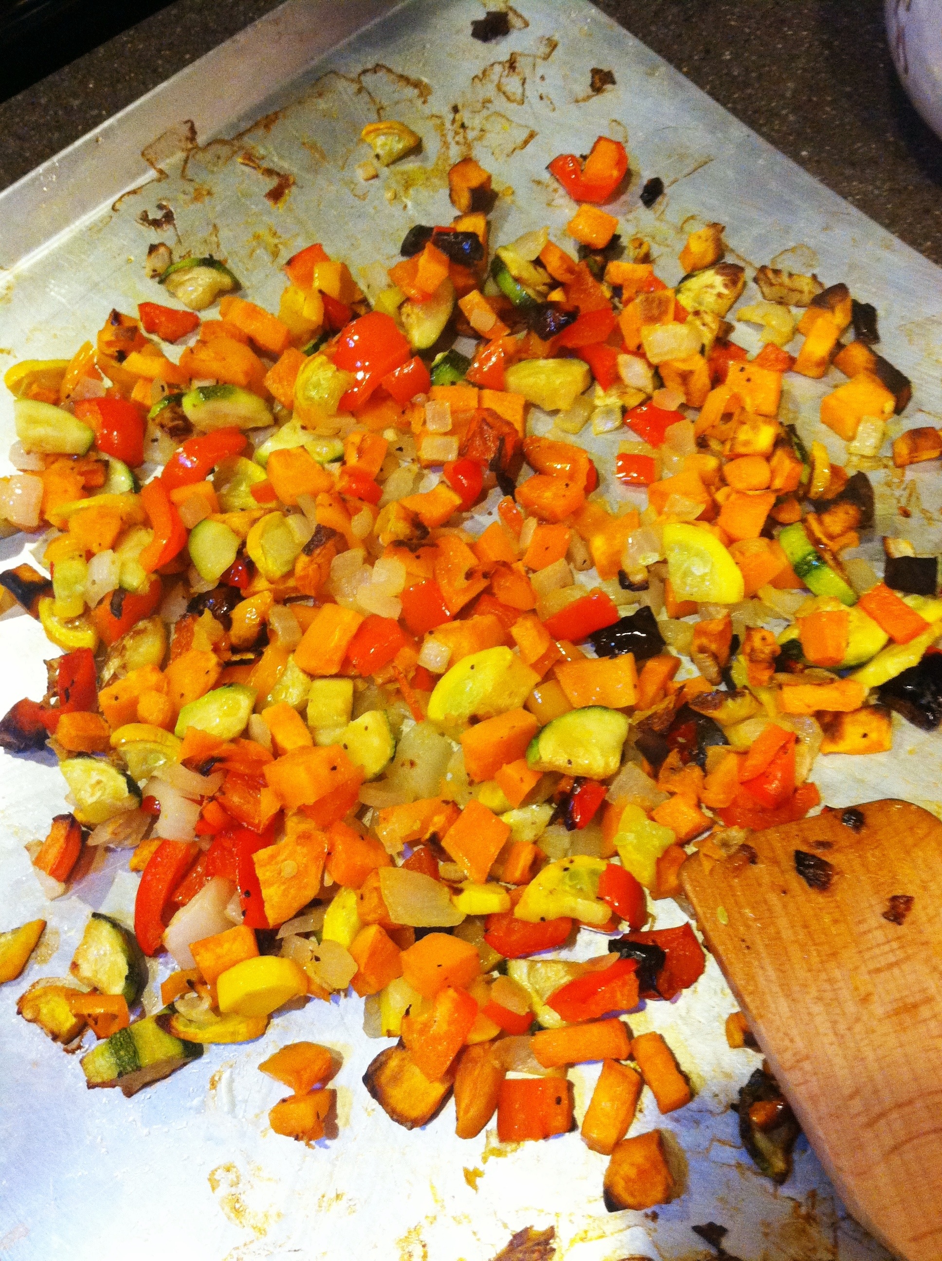 1. Preheat the oven to 400 degrees F. Place red pepper, zucchini, yellow squash, sweet potato, and onion on a large baking sheet. Drizzle with olive oil and toss until vegetables are coated. Season with salt and pepper. Roast vegetables for 30-40 minutes, or until tender, stirring occasionally. Remove vegetables from oven and let cool to room temperature. Reduce oven temperature to 350 degrees F.