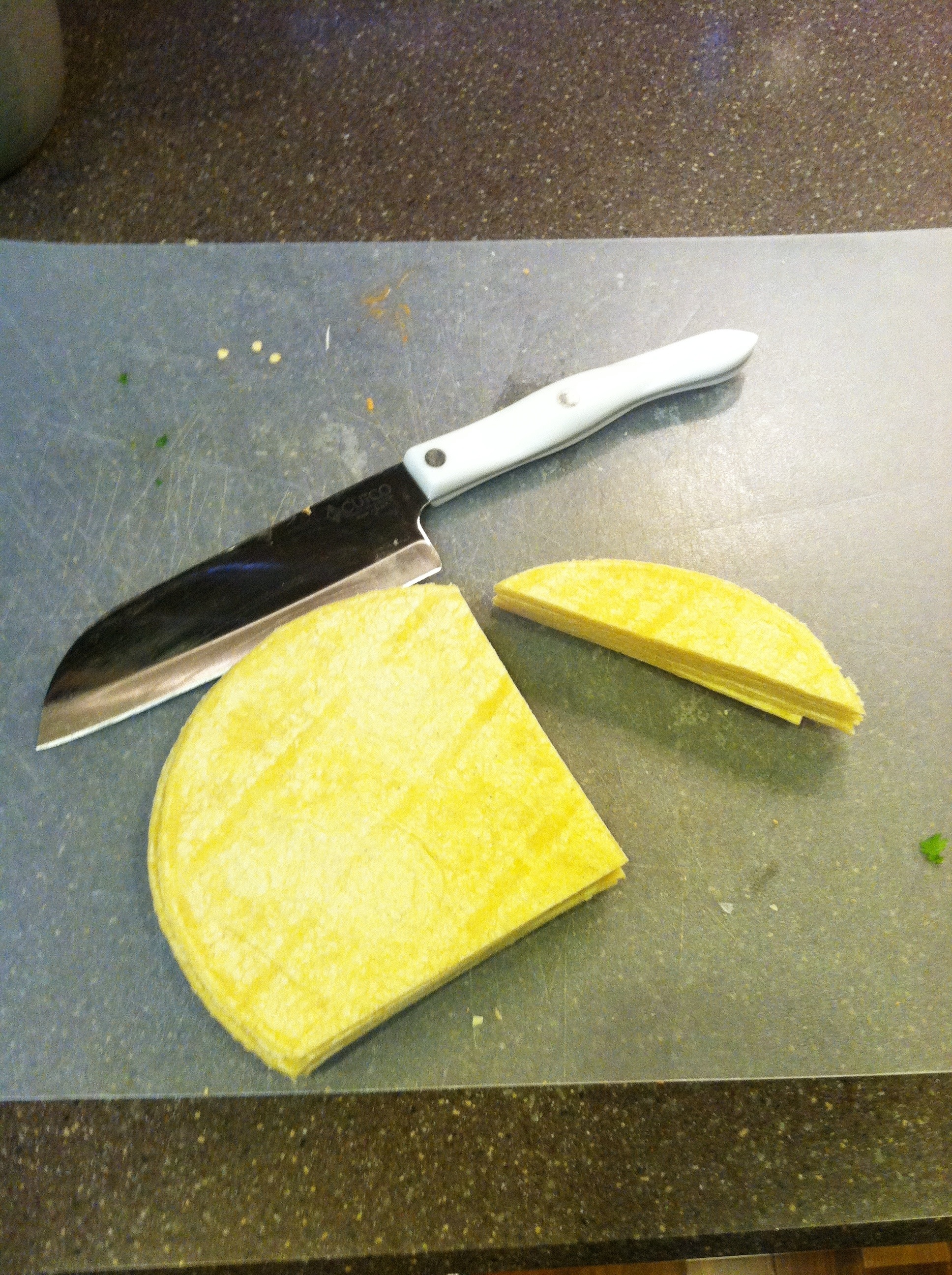 My mom taught my this trick to cut off two sides of the round tortillas. This makes them fit perfectly in the corners of pans with minimal overlap so you have a perfectly even layer. She’s a genius 🙂
