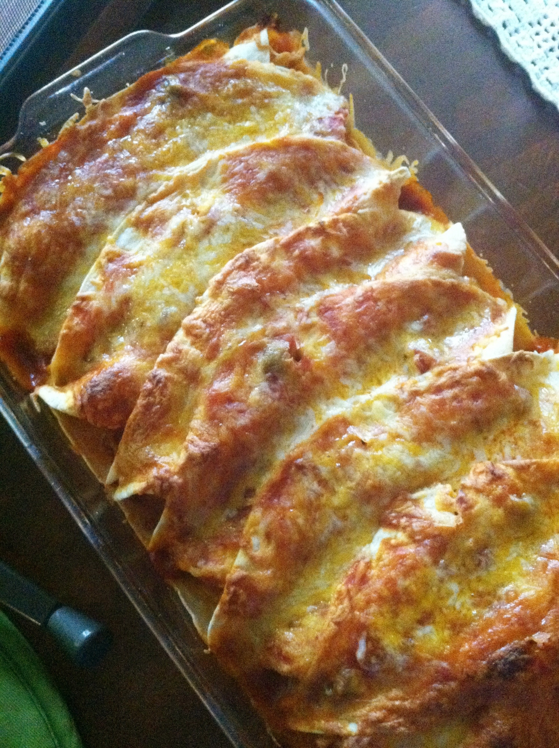 1. Heat oven to 375 degrees. Coat one 4-quart or two 2-quart baking dishes with nonstick cooking spray. If using 1 dish, spread 1/3 cup of the enchilada sauce in bottom. If using 2 dishes, spread half of the 1/3 cup of the enchilada sauce in bottom of each dish.