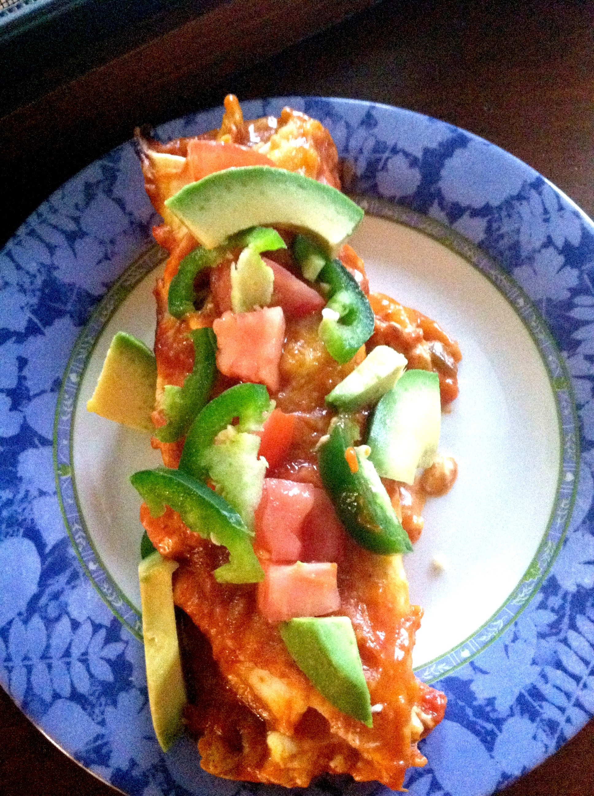 4. Pour remaining sauce over enchiladas, dividing evenly between dishes(if using two). Top with remaining cheese. Bake at 375 degrees for 20 minutes. Increase temperature to 400 degrees and bake an additional 5 minutes, until cheese begins to brown slightly. Garnish with whatever toppings you like: jalapeño slices, avocado, and cilantro. Enjoy!!!!