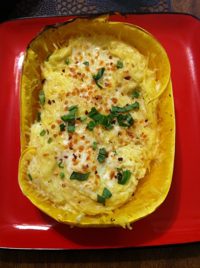 So I’ve said this before but seriously, I love spaghetti squash. It is so easy and I am just fascinated by how it turns all stringy and spaghetti like! This is cool recipe becuase it actually is very rich and filling just on it’s own. I am to be honest, not a big alfredo fan. Not that I don’t like it but never really have made it and given the choice out at a restaraunt I’d rather have something more fresh tasting with tomatoes veggies etc….. Anyway, I thought I would give this a try with one of the squashes my mom gave me last time I visited her and it turned out really good! Hope you enjoy!!!