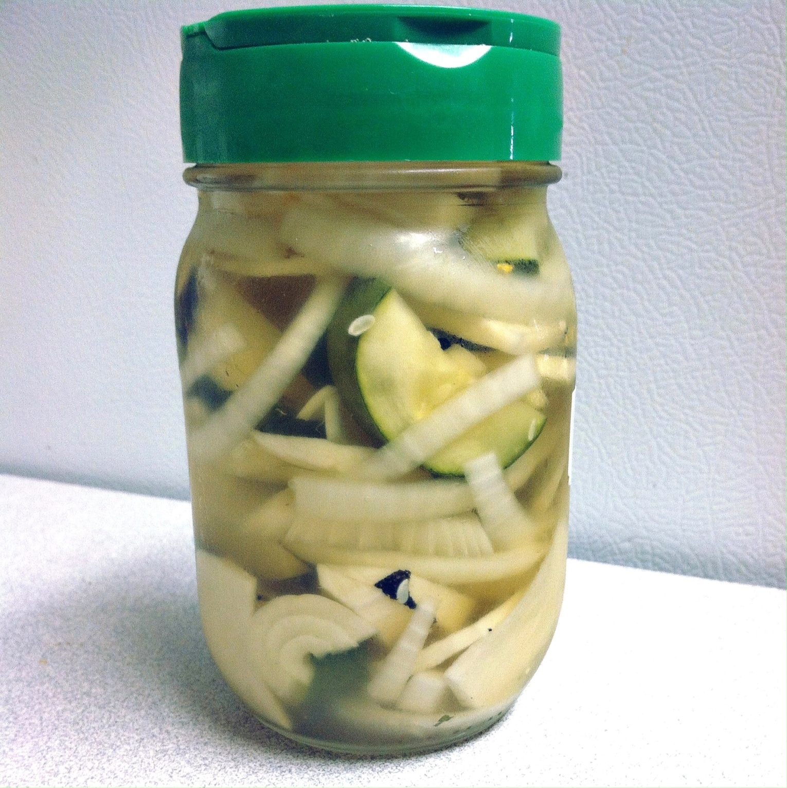 - Tightly pack the sliced radishes and onion in a clean quart-sized jar, and pour the hot liquid over them, making sure to pack the garlic, chile, and all those crushed peppercorns into the jar, too. Cover and cool. Stick in the fridge and enjoy!