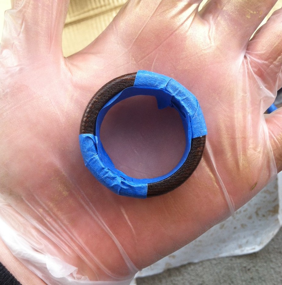Sooo last week’s post talked about how I went a little spray paint crazy. It all started by wanting to try to paint some string lights gold (for the wedding) call me crazy but I thought it would look awesome (it does). But to see those, you’ll have to tune in next week! 🙂 After spraying the lights and seeing how beautiful the gold paint went on and how glam it looked, I started rummaging around the house for other items to paint. Enter these napkin rings. Now you’re probably thinking “why do you have napkin rings” (I don’t know either) “do you really use napkin rings?” (like one time ever) – BUT they were my grandmas and while going through her stuff after she passed away, I came across these and thought they were rustic and cute and when if I have a dinner party then I’d use them. Then I thought I’d glam them up a little bit, also my heart wouldn’t break if the grand idea didn’t work out anyway. So I taped them up: