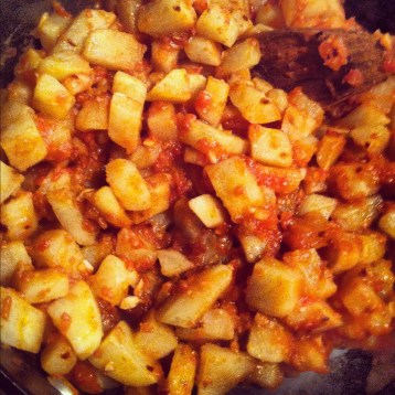 3. Heat olive oil in a large saucepan on medium heat. Add the onion, and season with salt and pepper. Cook, stirring frequently until the onion is tender, about 5 minutes, then add the garlic. Cook together for about 30 seconds then add the can of tomatoes(with juice). Continue to cook, still stirring frequently, until the tomatoes are beginning to fall apart a little, about 5 to 10 minutes.